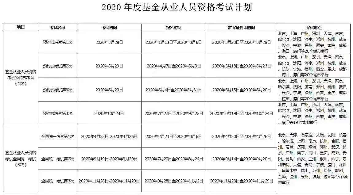 2020年度基金从业资格考试计划